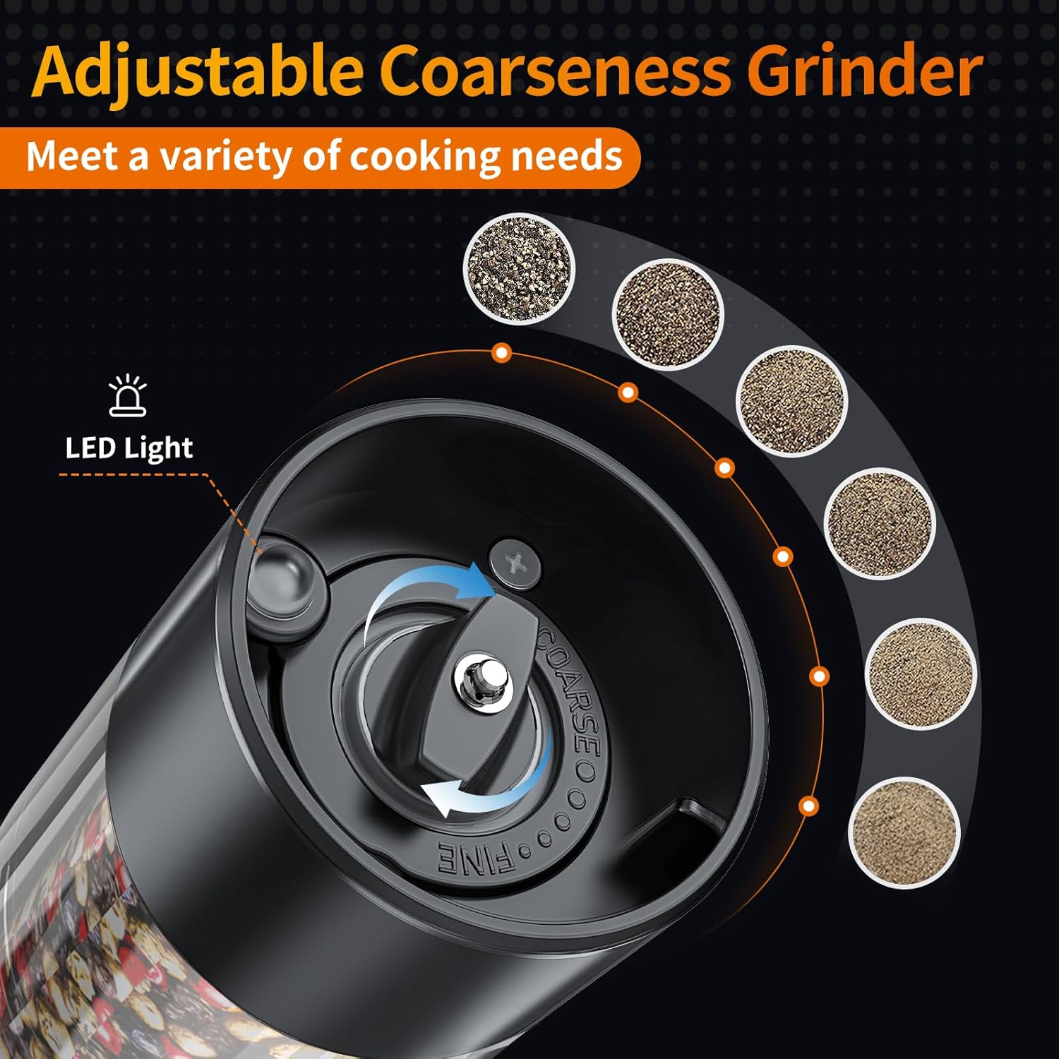 Warm White LED Lights: The rechargeable mills come with a convenient bright and soft LED light, illuminating your food for easy and accurate seasoning. No more guessing if you've added enough salt and pepper, the light will help you see exactly where you're milling, and create an atmosphere that makes the food more delicious and the surroundings more warm and romantic! Type-C fast charge enjoy more than 250 grinds on a single charge! Make cooking easier and more efficient