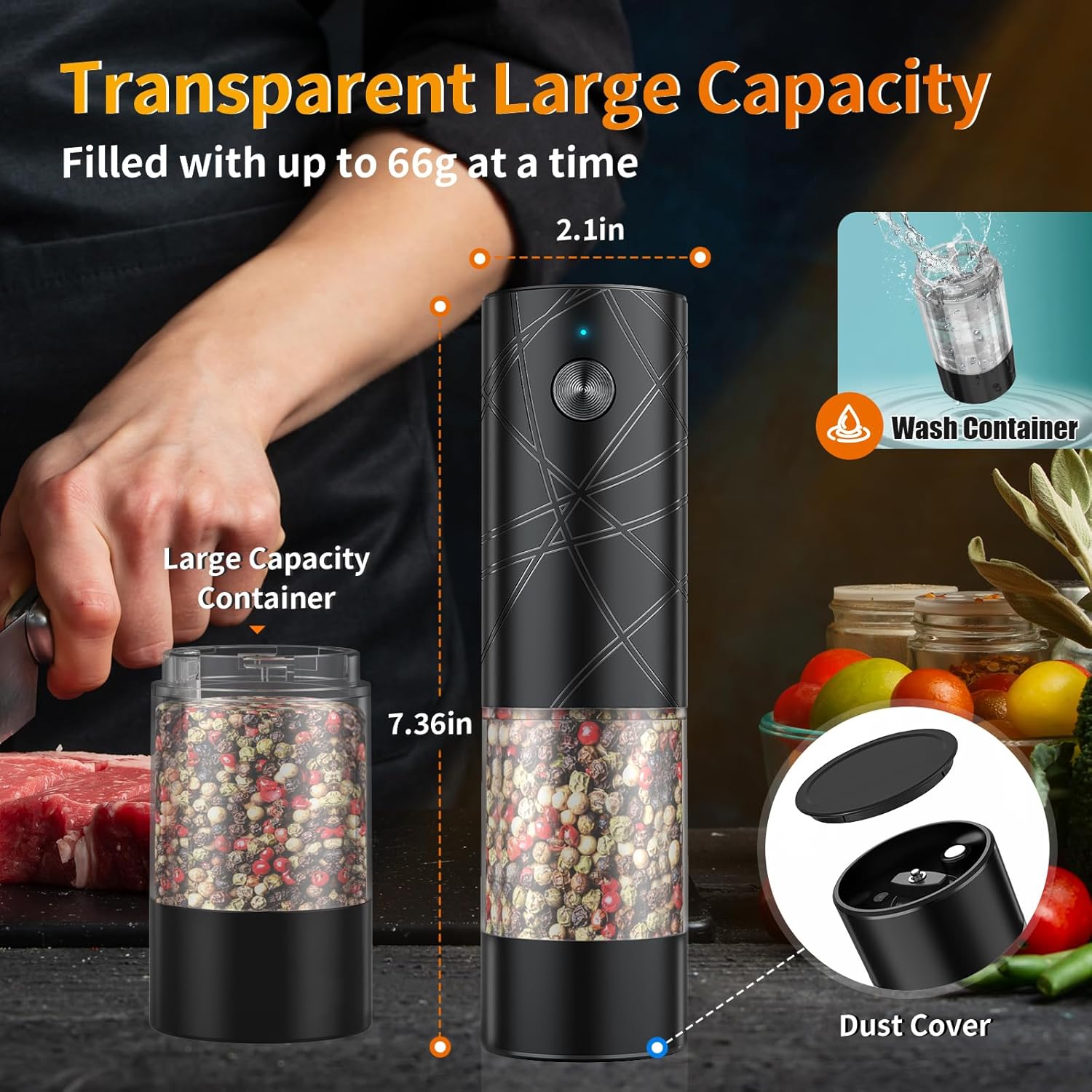 Large Capacity and Transparent Design: Our salt and pepper grinder set increases the capacity of the grinder, you don't need to refill your pepper mill as often. Made with transparent PMMA food grade material container, allows you to easily see the remaining spices and distinguish between different seasonings. Premium salt and pepper shakers are unbreakable and durable. Ceramic grinder core can better restore the aroma of fresh spices. (Note: The transparent container can be washed)