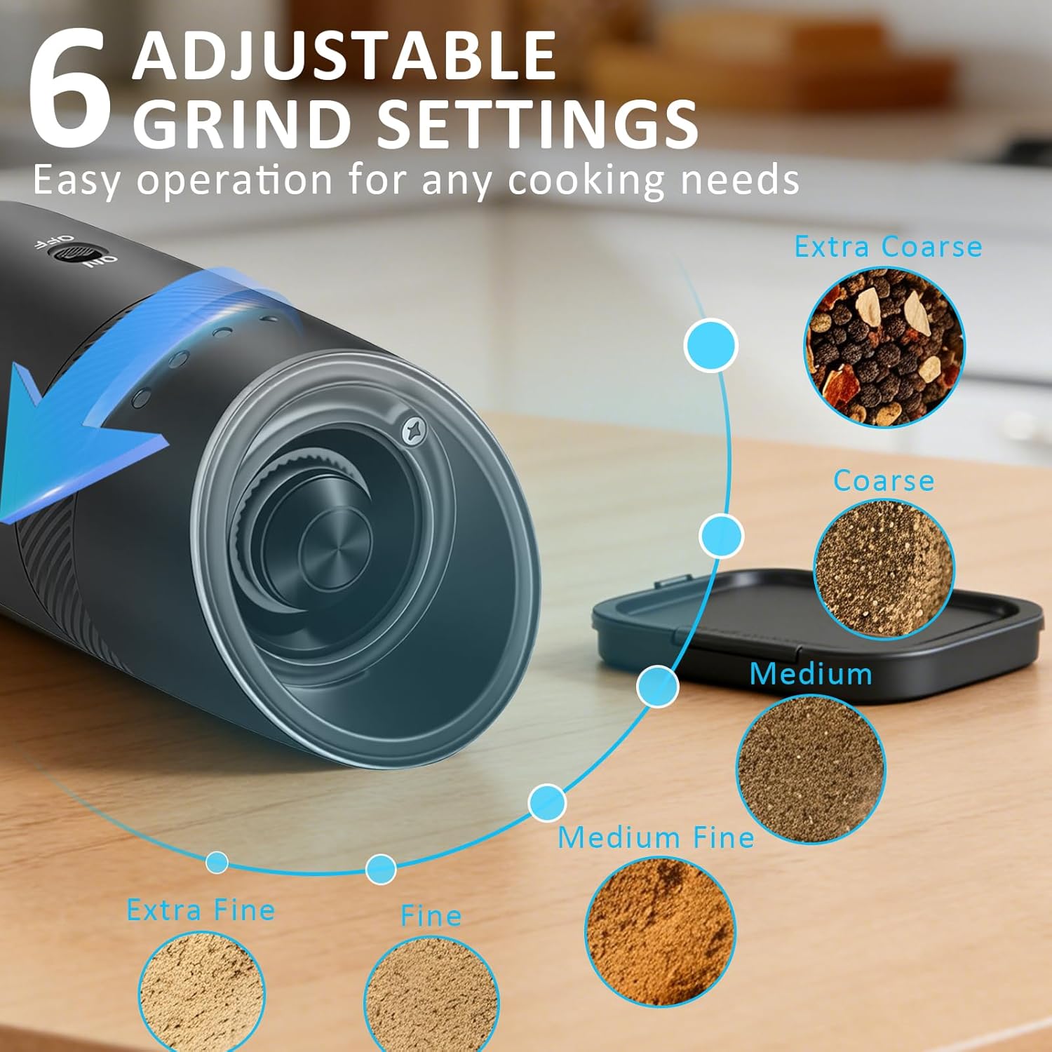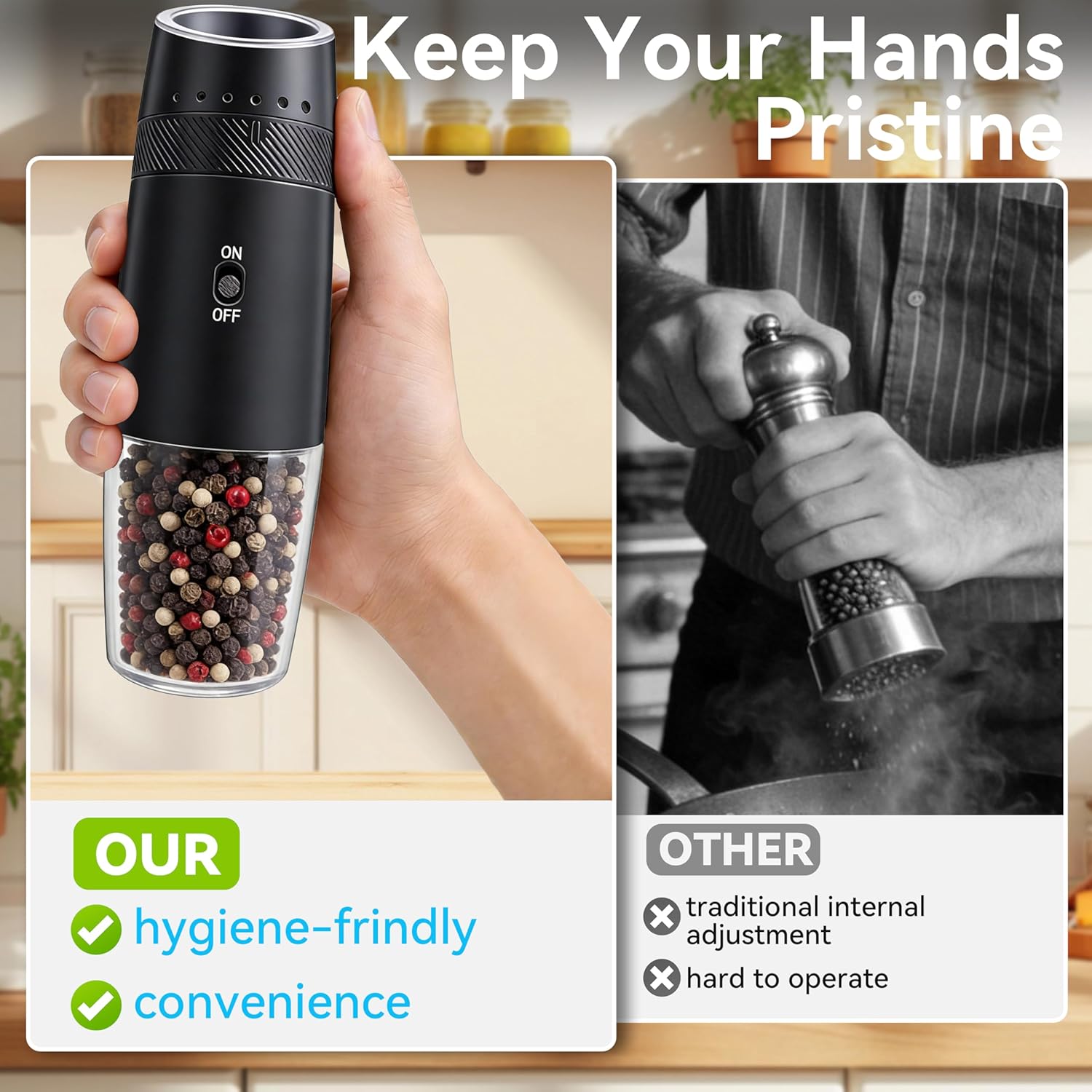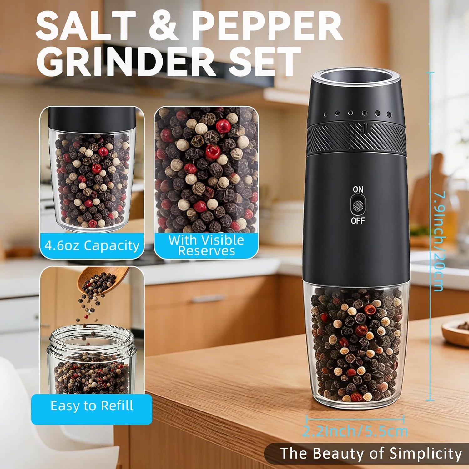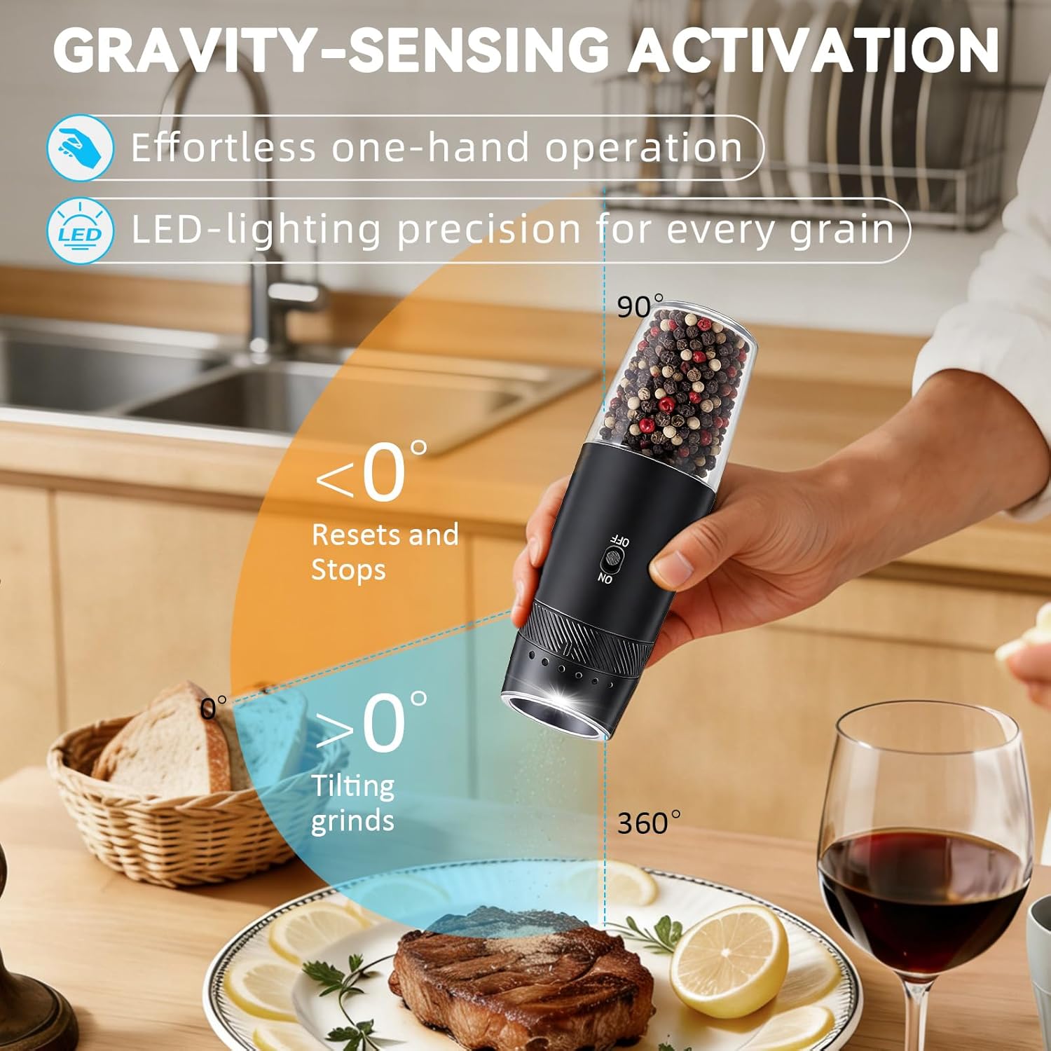 Gravity-Sensored Operation】: The salt and pepper shakers feature smart gravity sensor technology. Simply invert the grinder and press “ON” or “OFF” to enjoy freshly ground seasonings. Our smart gravity grinder enables truly one-handed operation—a clean, intuitive, and modern way to spice up any moment
